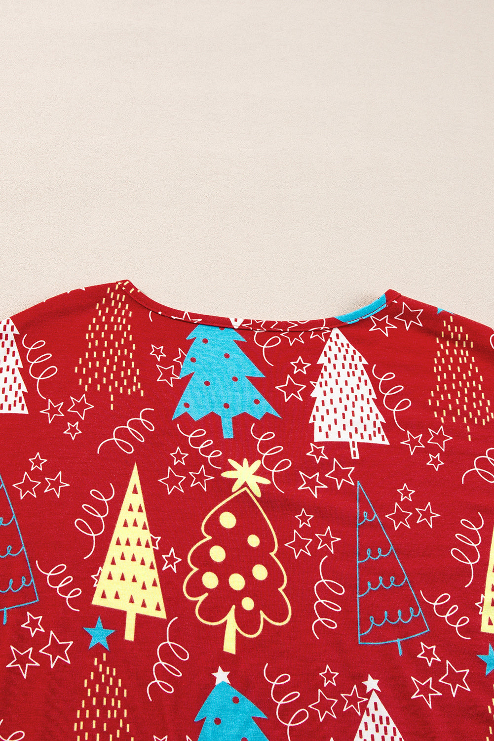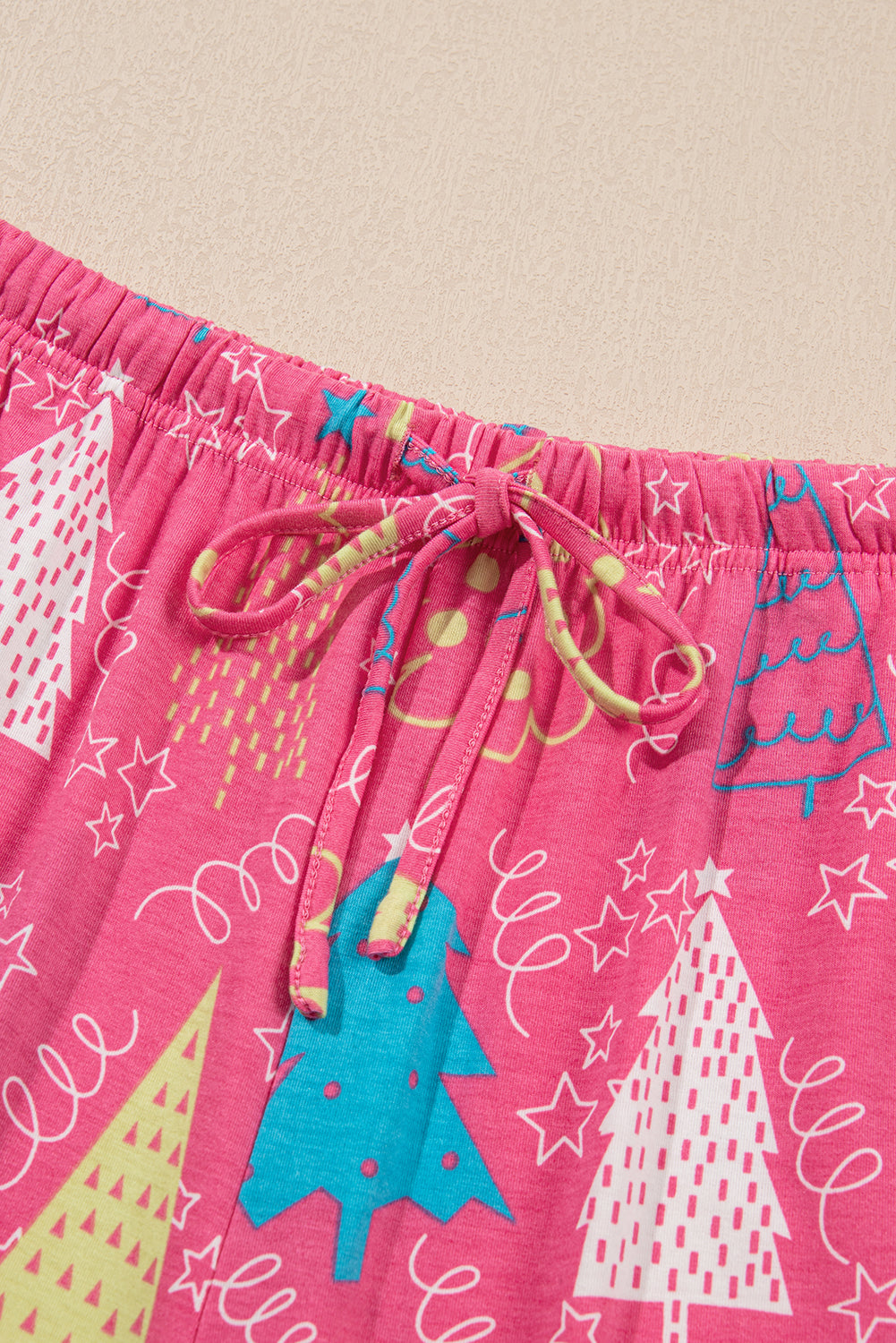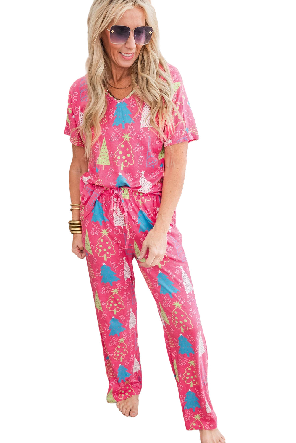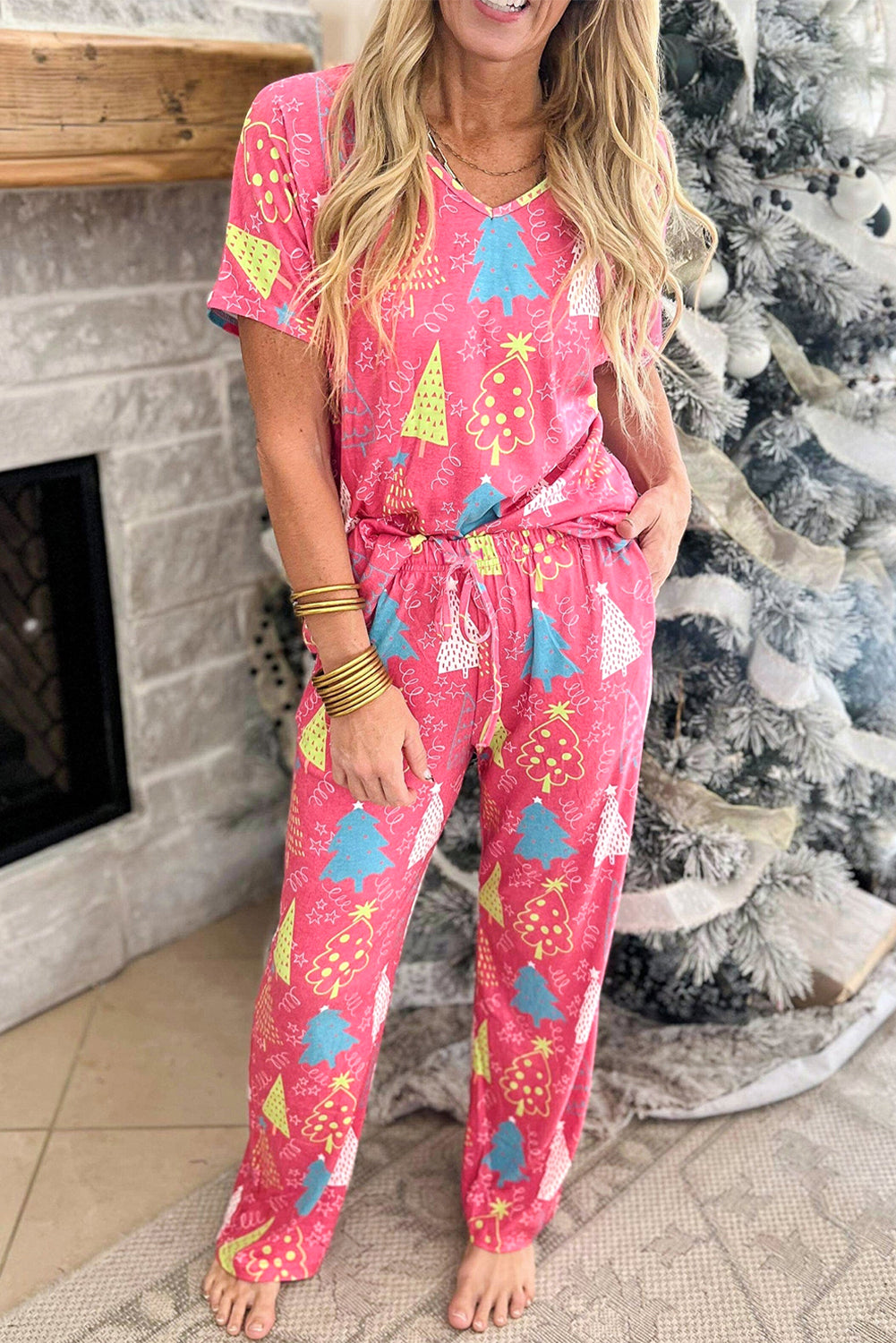 Rose Christmas Tree Print V Neck Tee and Pants Lounge Set